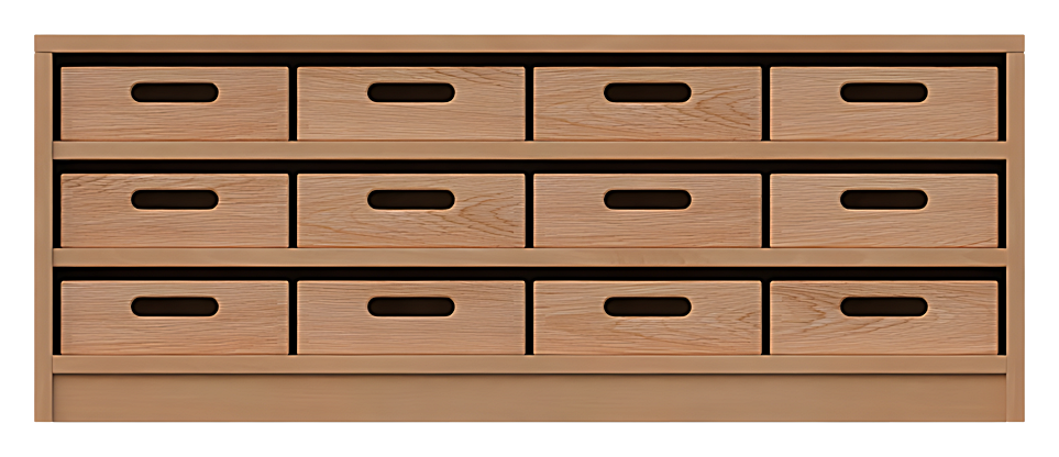 BxHxT 102 x 40 x 40 cmoffen, 2 Einlegeboden3 x 4 Materialkästenmit GriflochKästen: Buche natur, lackiert oder Birke natur, lackiert