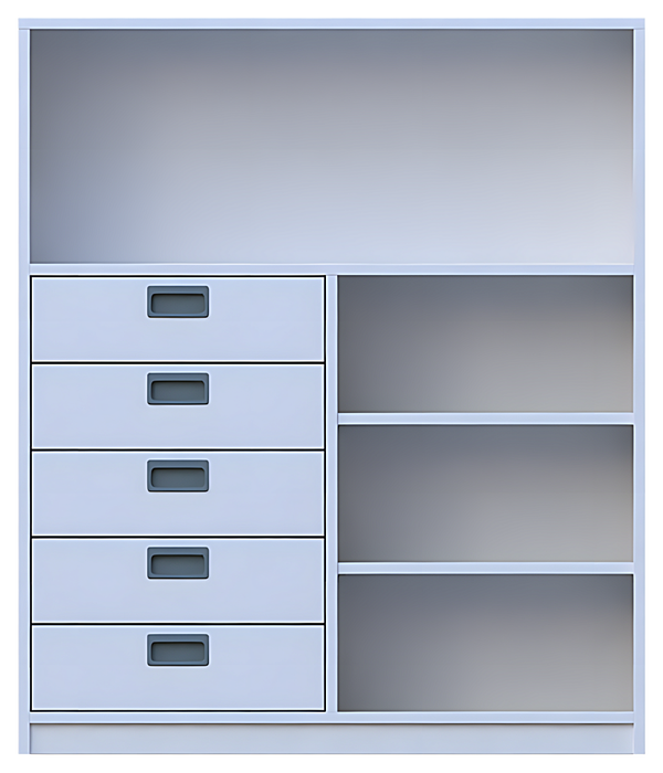 Korpusschrank oben ein offenes Fach, unten eine Seite Regalböden, eine Seite 5 Schubkästen