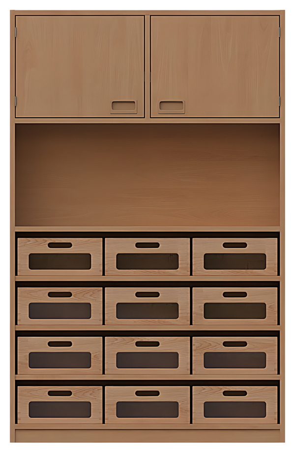Korpusschrank oben 2 kleine Türen, mittig offen, unten 12 Materialkästen mit Acrylglas
