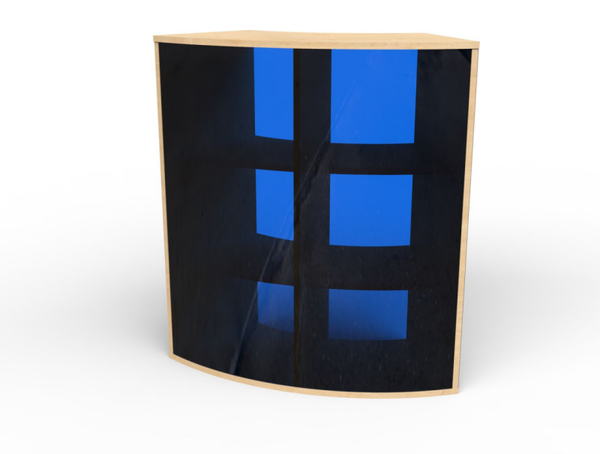 Sechstelkreisschrank H= 119,1 cm Außenradius ca. 102 cm Innenradius ca. 63 cm Gesamttiefe 40 cm Fachinnenmaß. BxHxT ca. 48,2 (28,7) x 34,1 x 37,6 cm Acrylwand im Außenradius mit 6 offenen Fächern